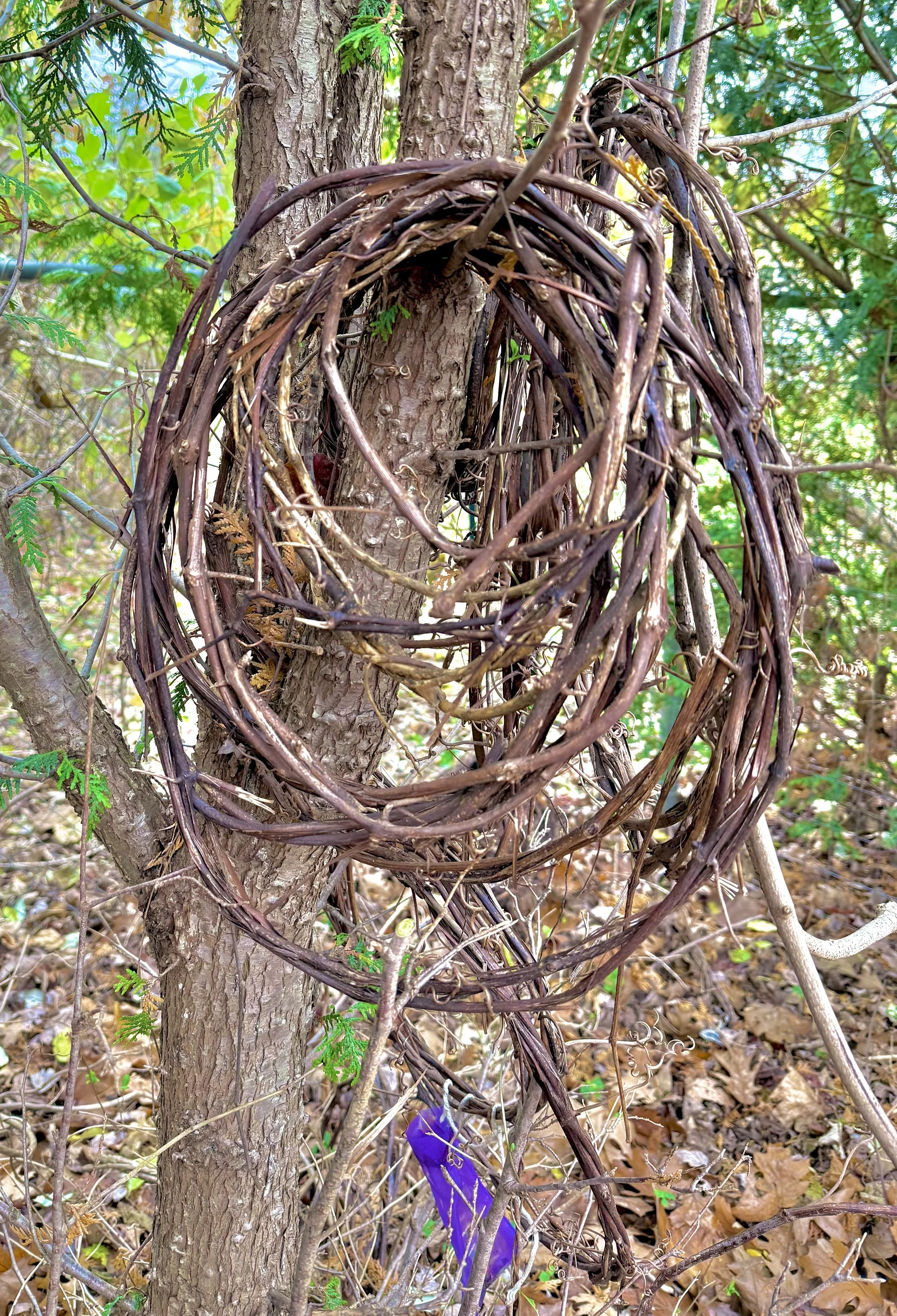 A wreath made of intertwined vine and green plant stems, hanging on a thin tree branch surrounded by dried vine tendrils.