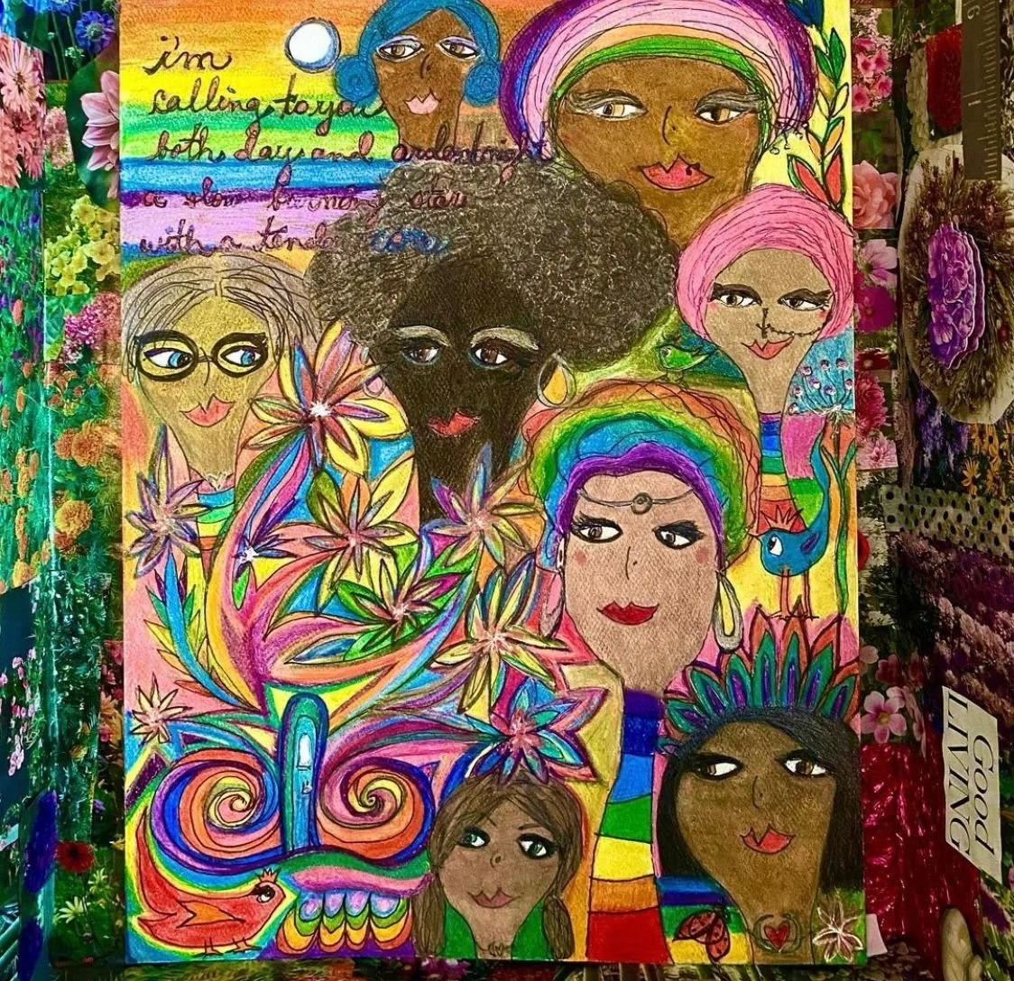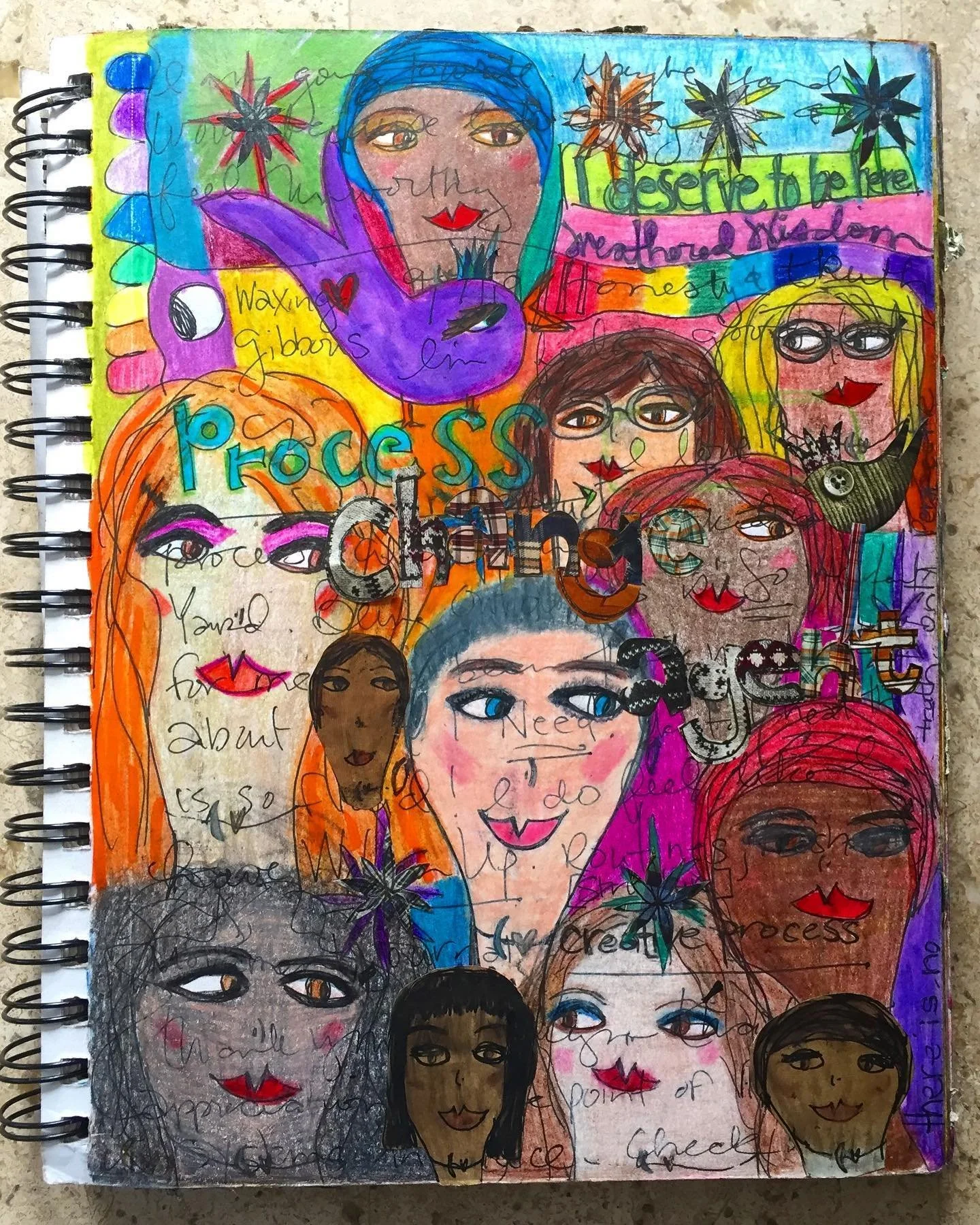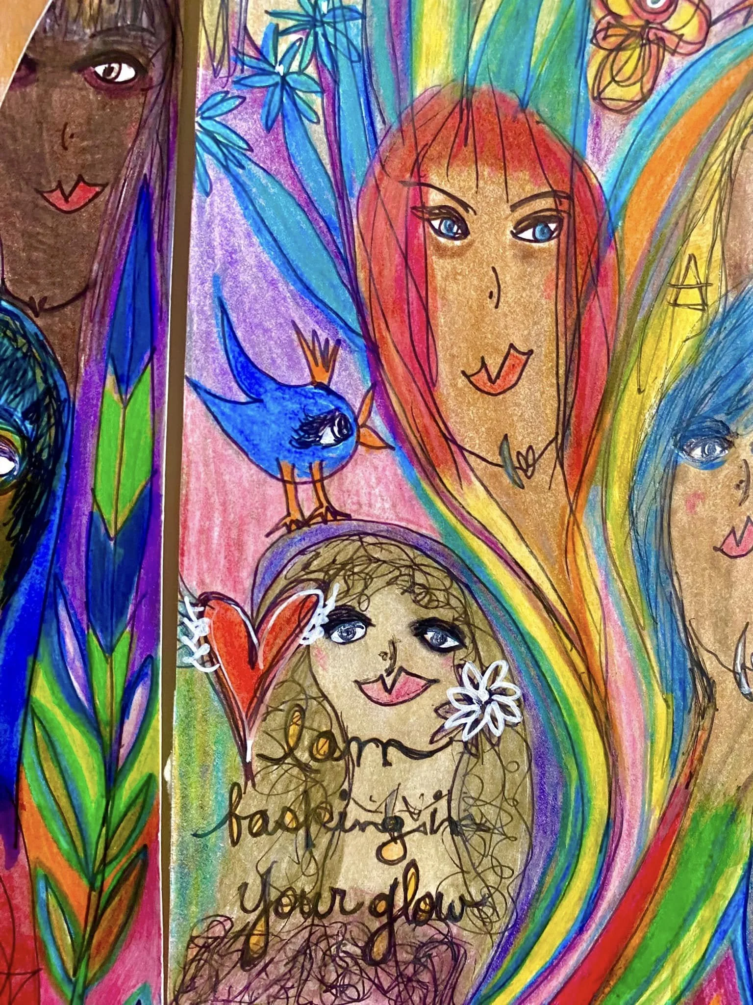 I paused from editing and reached for my colored pencils. I began drawing women’s faces—not something new for me, but this time, I layered them over my journal pages filled with gratitude lists, tarot readings, prayers, and creative ideas. Alongside the portraits, I scribbled mantras and added a whimsical ellis* to each page.