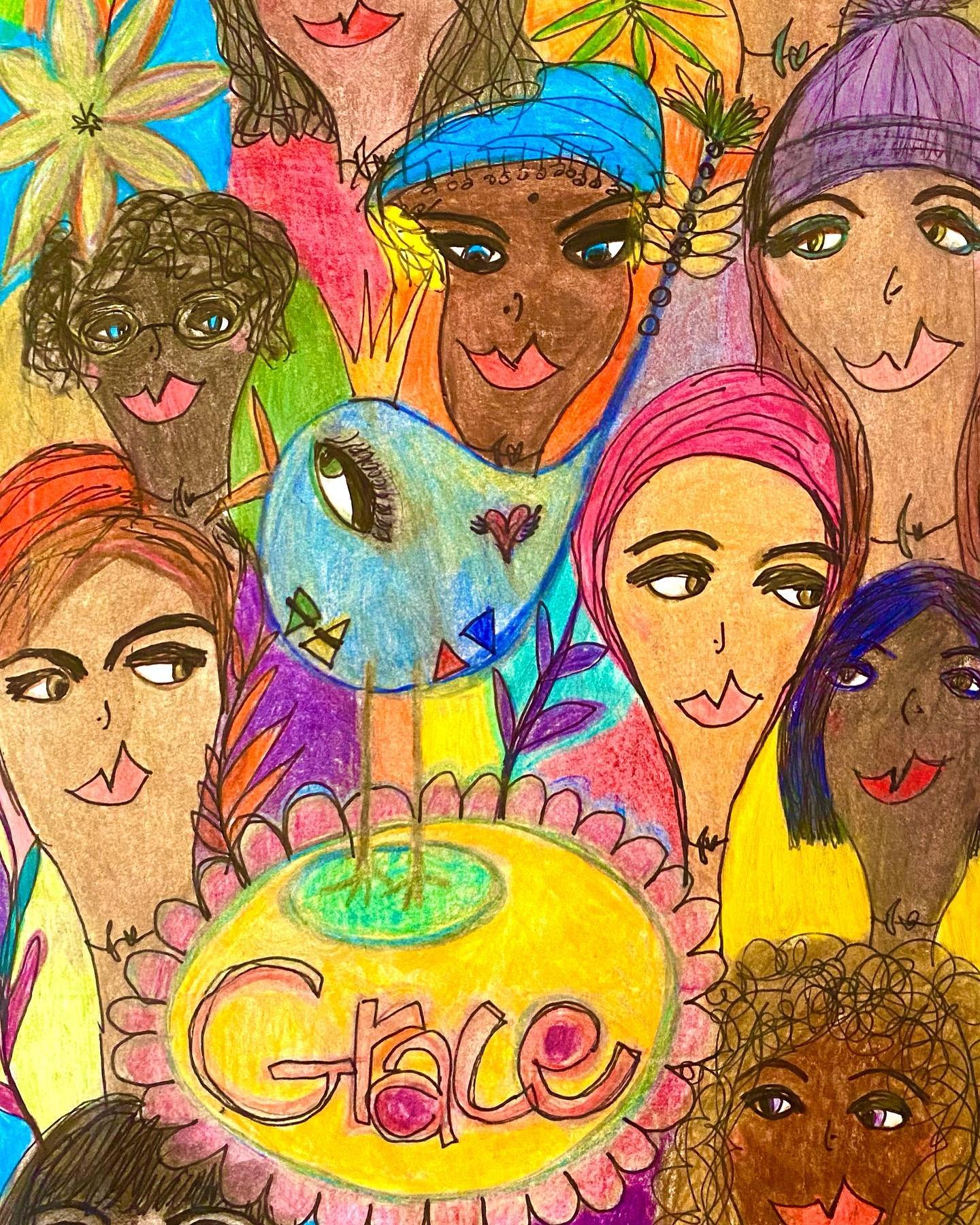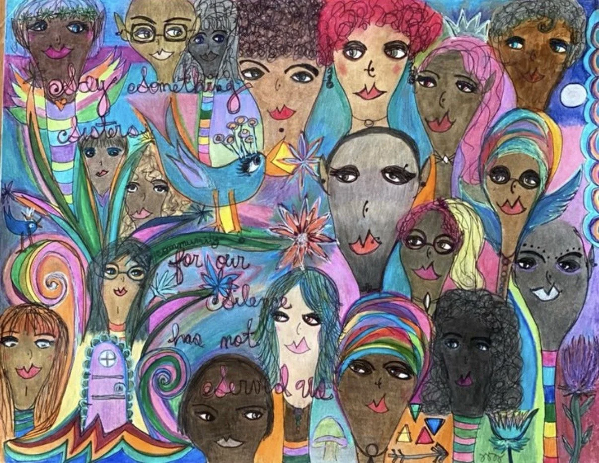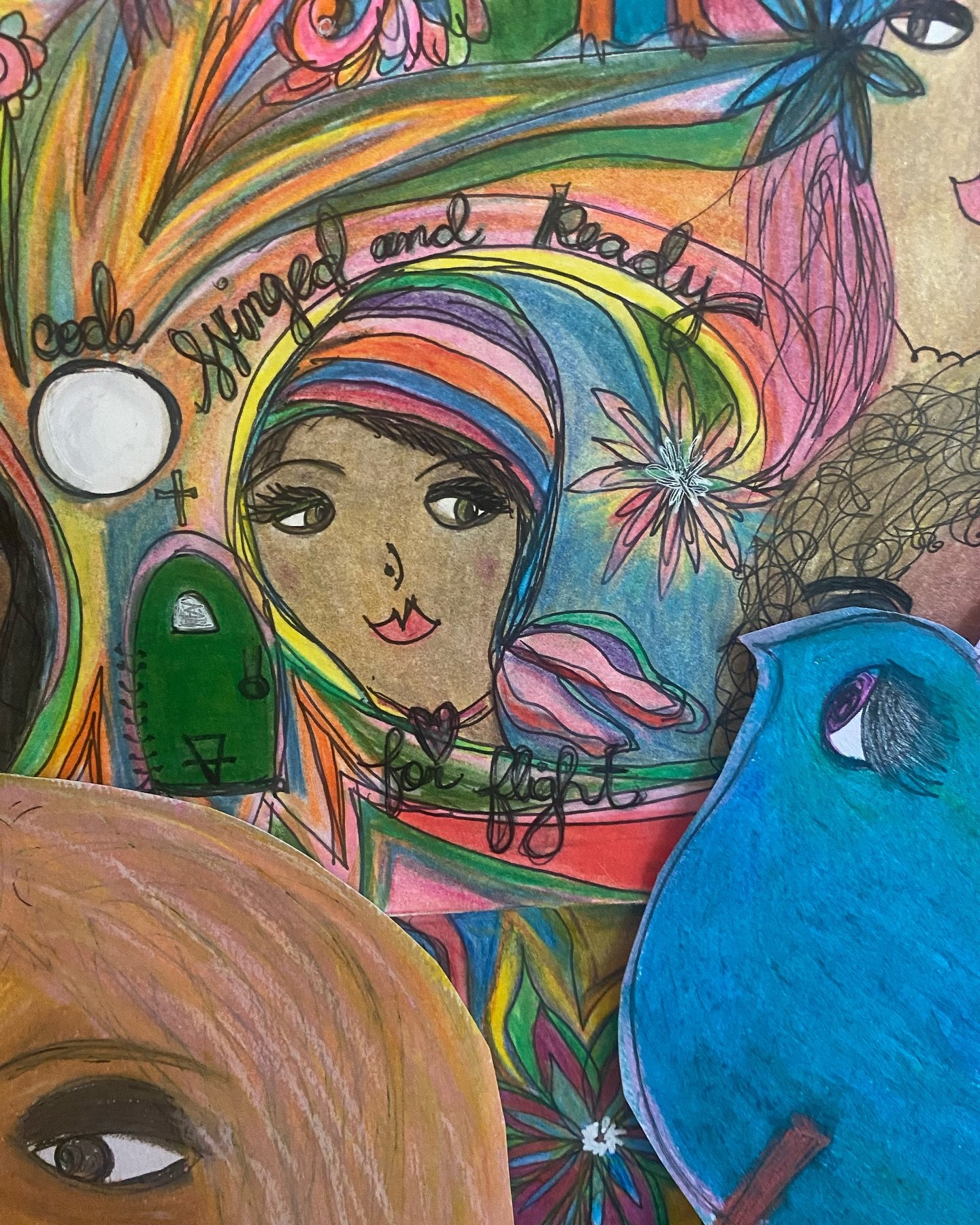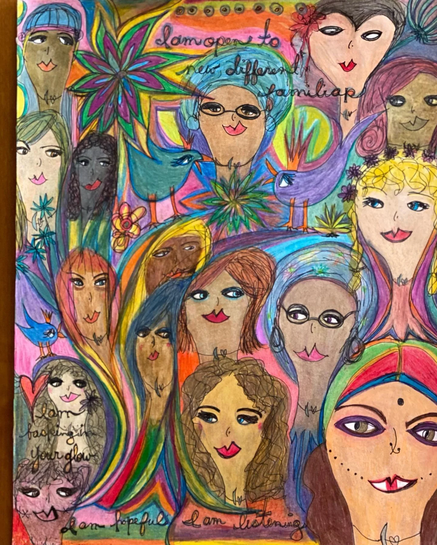 I paused from editing and reached for my colored pencils. I began drawing women’s faces—not something new for me, but this time, I layered them over my journal pages filled with gratitude lists, tarot readings, prayers, and creative ideas. Alongside the portraits, I scribbled mantras and added a whimsical ellis* to each page.